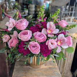 Price: $190.00 Foxglove- Faux and Preserved Botanical With A Portland Rose Candle Product Tags: Same-day Delivery