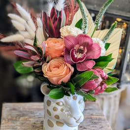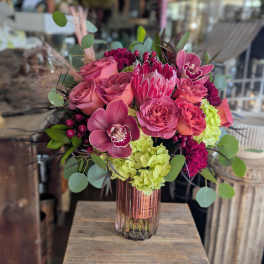 Price: $190.00 Foxglove- Faux and Preserved Botanical With A Portland Rose Candle Product Tags: Next-day Delivery