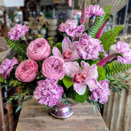Price: $190.00 Foxglove- Faux and Preserved Botanical With A Portland Rose Candle Product Tags: Same-day Delivery